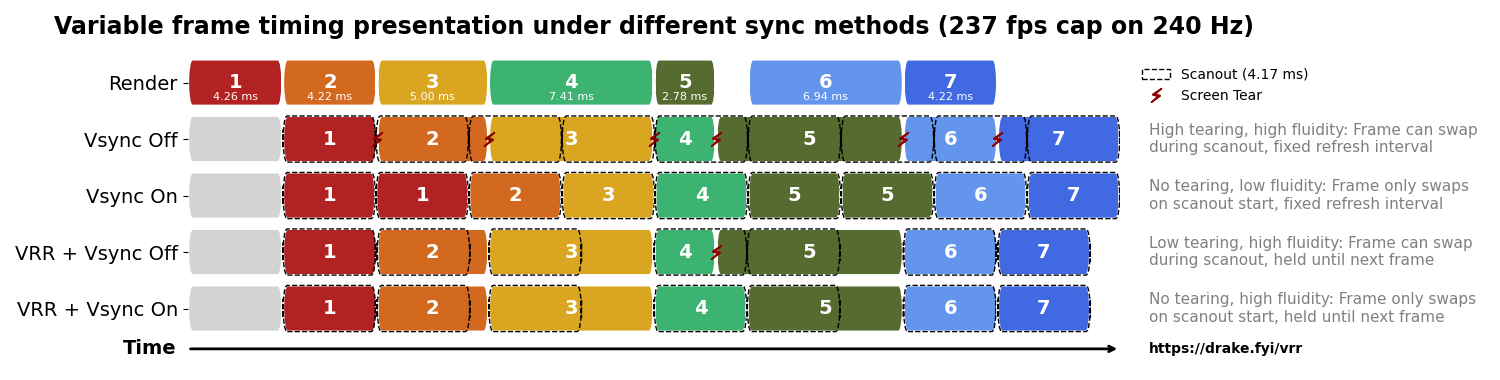 V-Sync: With VRR on + V-Sync off, if a new frame becomes ready early while the previous frame is still being scanned out onto the display (from top to bottom), the remaining scanout will be replaced by the new frame, resulting in tearing. The same is true for a frametime spike where the old frame exceeds the maximum frame hold time (VBLANK interval) and repeats whilst a new frame becomes ready and replaces it during the scanout. When V-Sync is enabled in conjunction with VRR, the driver will adhere to the display scanout by holding the new frame until a new scanout, which ensures no tearing. This replaces default V-Sync buffered behavior and therefore the only added input lag is preventing the frame from being overwritten during the active scanout.